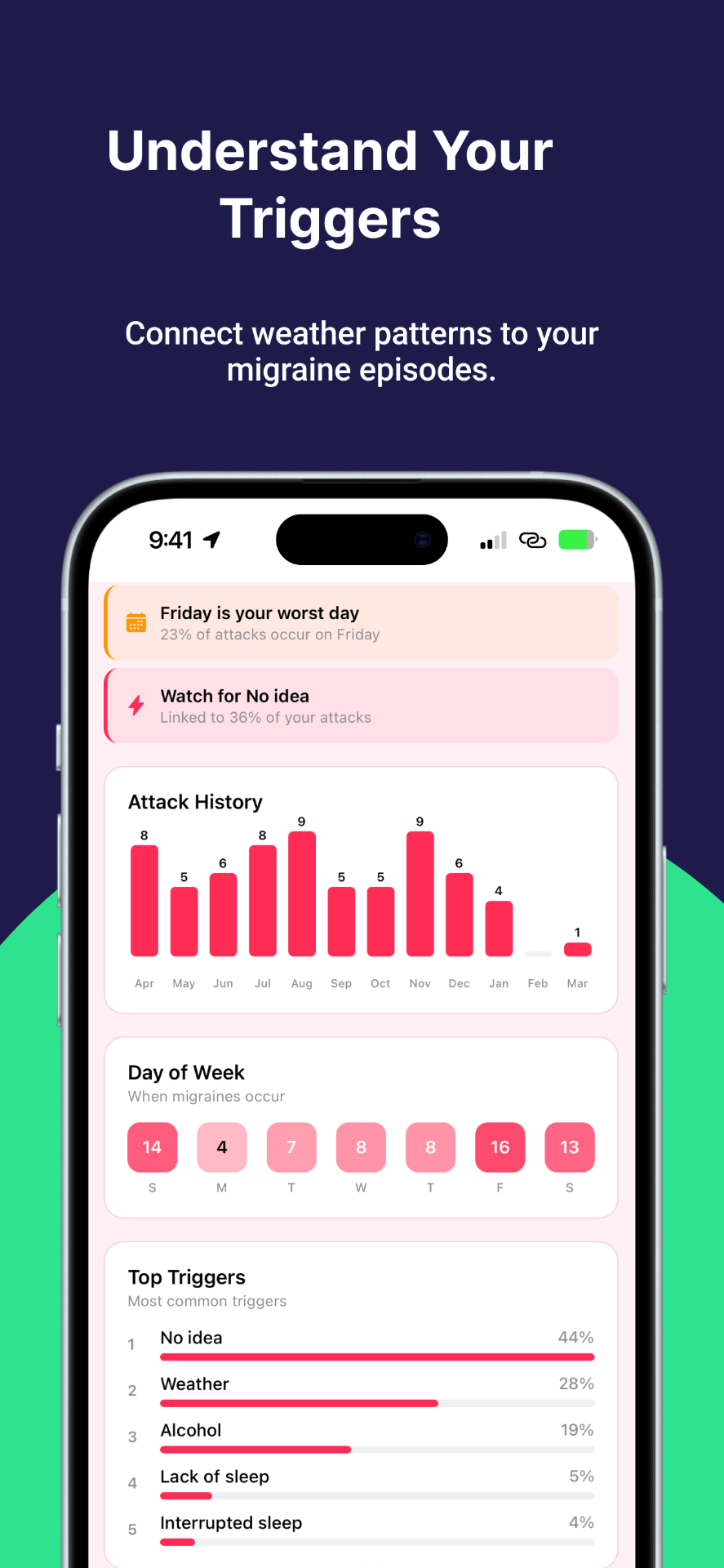 AI-powered migraine tracker with voice logging, weather-based attack predictions, and smart trigger analysis. Track symptoms hands-free during attacks and share PDF reports with your doctor.