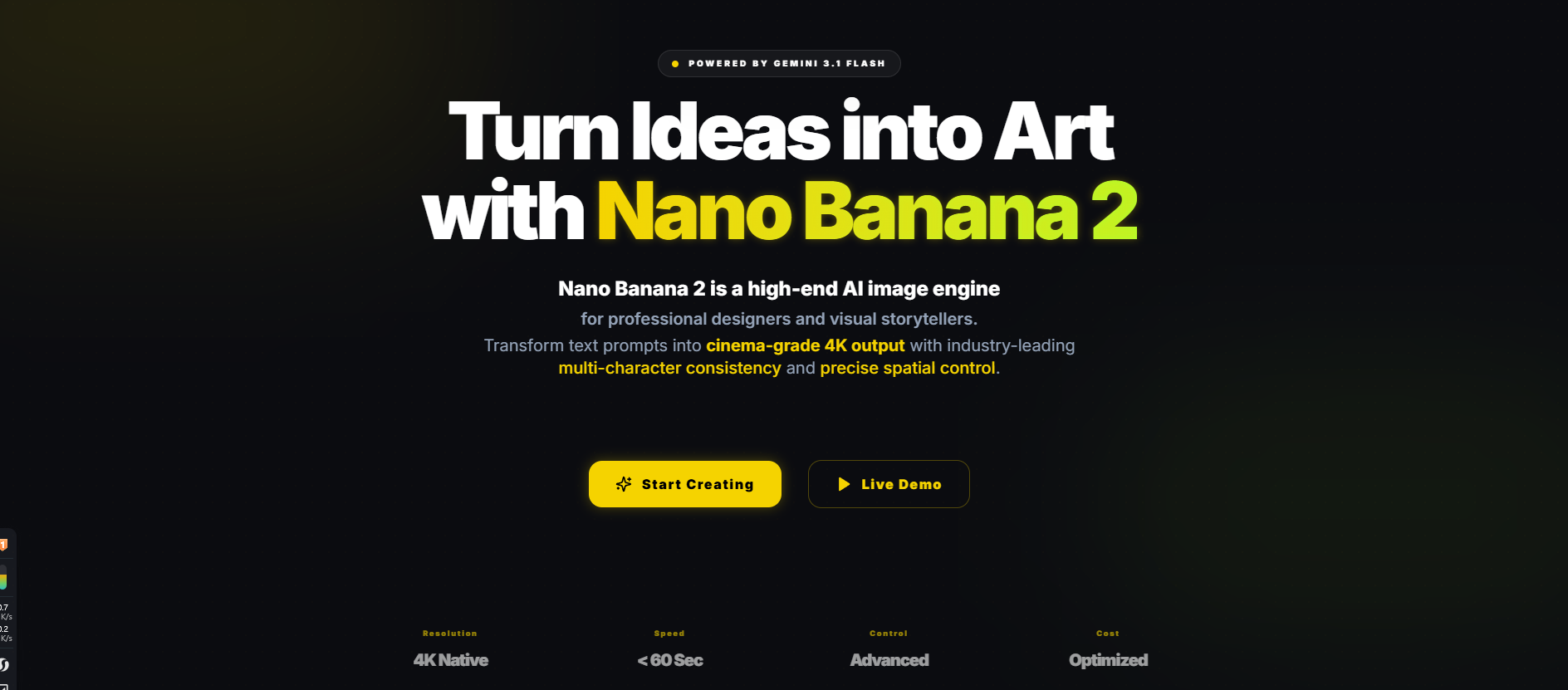 Nano Banana 2 is an ultra-fast AI image model that produces 2K images in 2–5 seconds and supports 4K resolution. It ensures consistent characters and objects, features precise text rendering and real-time web data, offers professional quality at a lower cost, and is widely used in comics, posters, e-commerce, and UI prototyping.