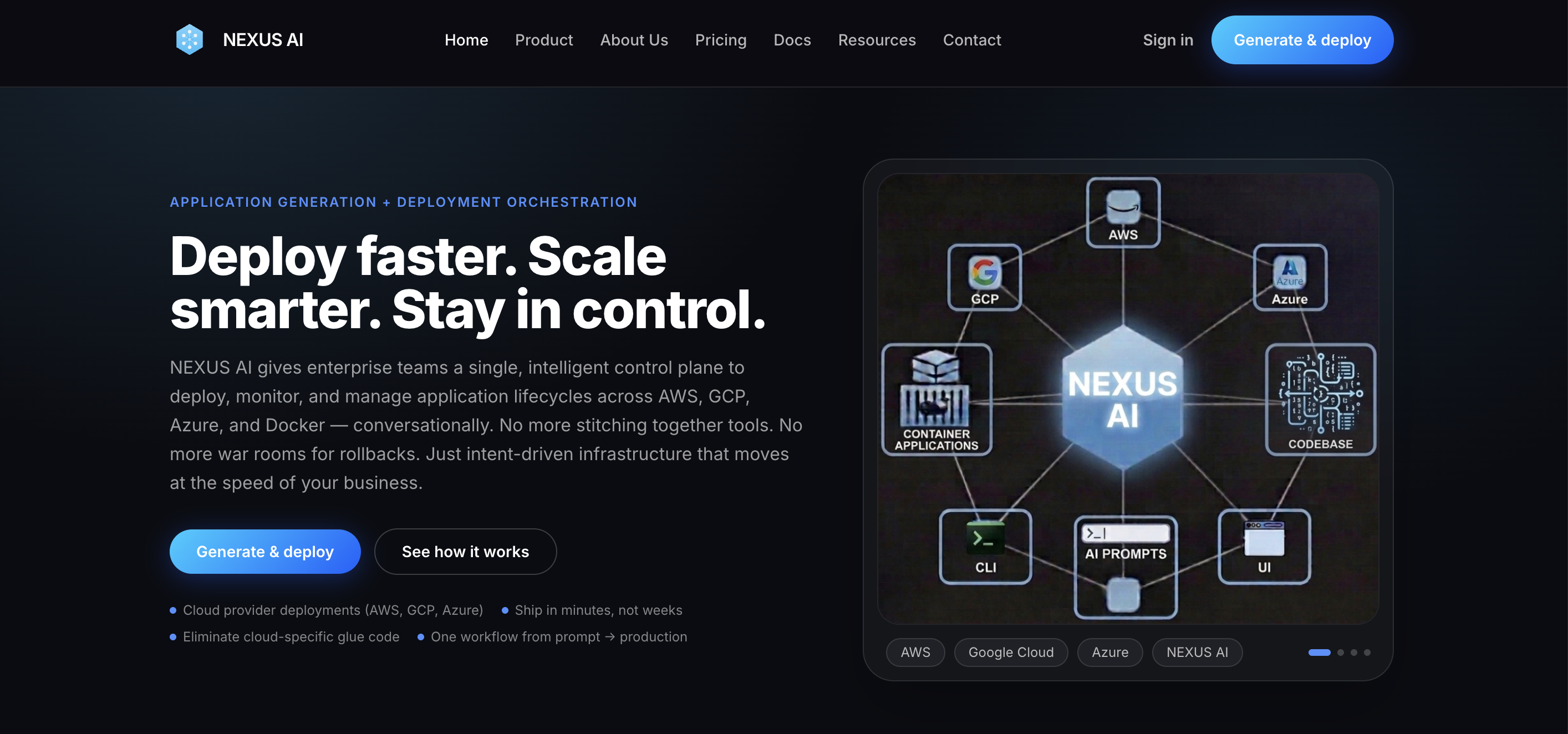 NEXUS AI gives enterprise teams a single, intelligent control plane to deploy, monitor, and manage application lifecycles across AWS, GCP, Azure, and Docker — conversationally. No more stitching together tools. No more war rooms for rollbacks. Just intent-driven infrastructure that moves at the speed of your business.